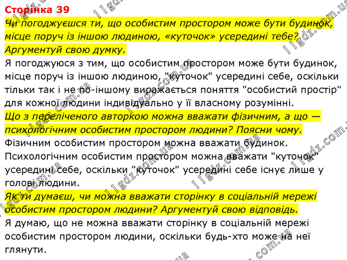 Чи погоджуєшся ти, що особистим простором може бути будинок, місце поруч із іншою людиною, «куточок» усередині тебе? Аргументуй свою думку. Я погоджуюся з тим, що особистим простором може бути будинок, місце поруч із іншою людиною, "куточок" усередині себе, оскільки тільки так і не по-іншому виражається поняття "особистий простір" для кожної людини індивідуально у її власному розумінні. Що з переліченого авторкою можна вважати фізичним, а що — психологічним особистим простором людини? Поясни чому. Фізичним особистим простором можна вважати будинок. Психологічним особистим простором можна вважати "куточок" усередині себе, оскільки "куточок" усередині себе існує лише у голові людини. Як ти думаєш, чи можна вважати сторінку в соціальній мережі особистим простором людини? Аргументуй свою відповідь. Я думаю, що не можна вважати сторінку в соціальній мережі особистим простором людини, оскільки будь-хто може на неї глянути.