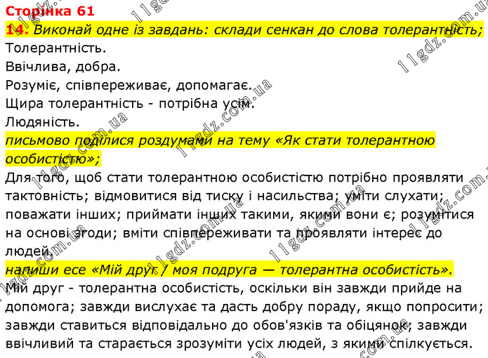 Виконай одне із завдань: склади сенкан до слова толерантність; Толерантність. Ввічлива, добра. Розуміє, співпереживає, допомагає. Щира толерантність - потрібна усім. Людяність. письмово поділися роздумами на тему «Як стати толерантною особистістю»; Для того, щоб стати толерантною особистістю потрібно проявляти тактовність; відмовитися від тиску і насильства; уміти слухати; поважати інших; приймати інших такими, якими вони є; розумітися на основі згоди; вміти співпереживати та проявляти інтерес до людей. напиши есе «Мій друг / моя подруга — толерантна особистість». Мій друг - толерантна особистість, оскільки він завжди прийде на допомога; завжди вислухає та дасть добру пораду, якщо попросити; завжди ставиться відповідально до обов'язків та обіцянок; завжди ввічливий та старається зрозуміти усіх людей, з якими спілкується.