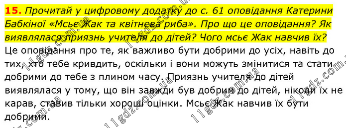 Прочитай у цифровому додатку до с. 61 оповідання Катерини Бабкіної «Мсьє Жак та квітнева риба». Про що це оповідання? Як виявлялася приязнь учителя до дітей? Чого мсьє Жак навчив їх? Це оповідання про те, як важливо бути добрими до усіх, навіть до тих, хто тебе кривдить, оскільки і вони можуть змінитися та стати добрими до тебе з плином часу. Приязнь учителя до дітей виявлялася у тому, що він завжди був добрим до дітей, ніколи їх не карав, ставив тільки хороші оцінки. Мсьє Жак навчив їх бути добрими.