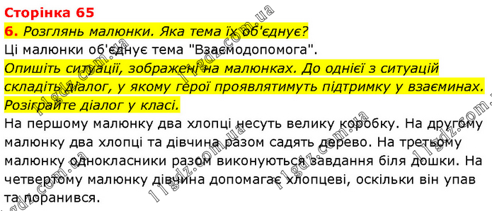 Розглянь малюнки. Яка тема їх об'єднує? Ці малюнки об'єднує тема "Взаємодопомога". Опишіть ситуації, зображені на малюнках. До однієї з ситуацій складіть діалог, у якому герої проявлятимуть підтримку у взаєминах. Розіграйте діалог у класі. На першому малюнку два хлопці несуть велику коробку. На другому малюнку два хлопці та дівчина разом садять дерево. На третьому малюнку однокласники разом виконуються завдання біля дошки. На четвертому малюнку дівчина допомагає хлопцеві, оскільки він упав та поранився.