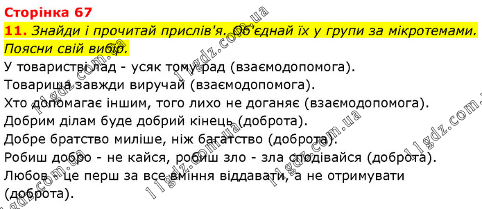Знайди і прочитай прислів'я. Об'єднай їх у групи за мікротемами. Поясни свій вибір. У товаристві лад - усяк тому рад (взаємодопомога). Товариша завжди виручай (взаємодопомога). Хто допомагає іншим, того лихо не доганяє (взаємодопомога). Добрим ділам буде добрий кінець (доброта). Добре братство миліше, ніж багатство (доброта). Робиш добро - не кайся, робиш зло - зла сподівайся (доброта). Любов - це перш за все вміння віддавати, а не отримувати (доброта).