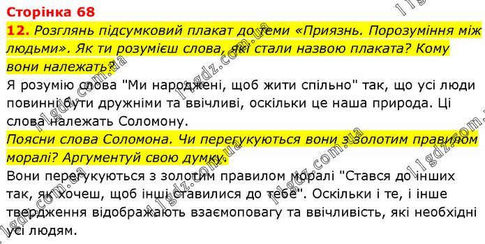 Розглянь підсумковий плакат до теми «Приязнь. Порозуміння між людьми». Як ти розумієш слова, які стали назвою плаката? Кому вони належать? Я розумію слова "Ми народжені, щоб жити спільно" так, що усі люди повинні бути дружніми та ввічливі, оскільки це наша природа. Ці слова належать Соломону. Поясни слова Соломона. Чи перегукуються вони з золотим правилом моралі? Аргументуй свою думку. Вони перегукуються з золотим правилом моралі "Стався до інших так, як хочеш, щоб інші ставилися до тебе". Оскільки і те, і інше твердження відображають взаємоповагу та ввічливість, які необхідні усі людям.