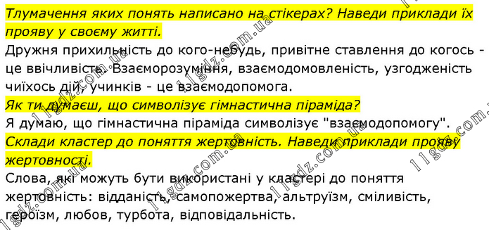 Тлумачення яких понять написано на стікерах? Наведи приклади їх прояву у своєму житті. Дружня прихильність до кого-небудь, привітне ставлення до когось - це ввічливість. Взаєморозуміння, взаємодомовленість, узгодженість чиїхось дій, учинків - це взаємодопомога. Як ти думаєш, що символізує гімнастична піраміда? Я думаю, що гімнастична піраміда символізує "взаємодопомогу". Склади кластер до поняття жертовність. Наведи приклади прояву жертовності. Слова, які можуть бути використані у кластері до поняття жертовність: відданість, самопожертва, альтруїзм, сміливість, героїзм, любов, турбота, відповідальність.