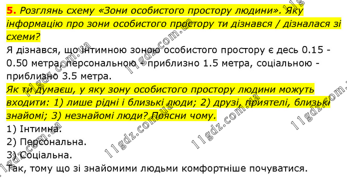 Розглянь схему «Зони особистого простору людини». Яку інформацію про зони особистого простору ти дізнався / дізналася зі схеми? Я дізнався, що інтимною зоною особистого простору є десь 0.15 - 0.50 метра, персональною - приблизно 1.5 метра, соціальною - приблизно 3.5 метра. Як ти думаєш, у яку зону особистого простору людини можуть входити: 1) лише рідні і близькі люди; 2) друзі, приятелі, близькі знайомі; 3) незнайомі люди? Поясни чому. 1) Інтимна. 2) Персональна. 3) Соціальна. Так, тому що зі знайомими людьми комфортніше почуватися.