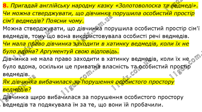 Пригадай англійську народну казку «Золотоволоска та ведмеді». Чи можна стверджувати, що дівчинка порушила особистий простір сім'ї ведмедів? Поясни чому. Можна стверджувати, що дівчинка порушила особистий простір сім'ї ведмедів, тому що вона використовувала особисті речі ведмедів. Чи мала право дівчинка заходити в хатинку ведмедів, коли їх не було вдома? Аргументуй свою відповідь. Дівчинка не мала право заходити в хатинку ведмедів, коли їх не було вдома, оскільки це приватна власність та особистий простір ведмедів. Як дівчинка вибачилася за порушення особистого простору ведмедів? Дівчинка щиро вибачилася за порушення особистого простору ведмедів та подякувала їм за те, що вони їй пробачили.