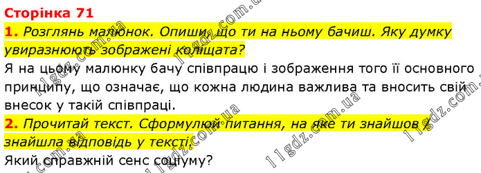 1. Розглянь малюнок. Опиши, що ти на ньому бачиш. Яку думку увиразнюють зображені коліщата? Я на цьому малюнку бачу співпрацю і зображення того її основного принципу, що означає, що кожна людина важлива та вносить свій внесок у такій співпраці. 2. Прочитай текст. Сформулюй питання, на яке ти знайшов / знайшла відповідь у тексті. Який справжній сенс соціуму?