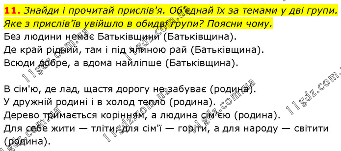 Знайди і прочитай прислів'я. Об'єднай їх за темами у дві групи. Яке з прислів'їв увійшло в обидві групи? Поясни чому. Без людини немає Батьківщини (Батьківщина). Де край рідний, там і під ялиною рай (Батьківщина). Всюди добре, а вдома найліпше (Батьківщина). В сім'ю, де лад, щастя дорогу не забуває (родина). У дружній родині і в холод тепло (родина). Дерево тримається корінням, а людина сім'єю (родина). Для себе жити — тліти, для сім'ї — горіти, а для народу — світити (родина).