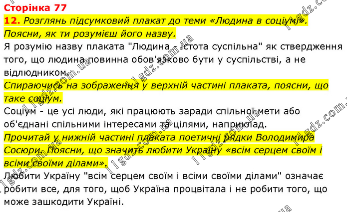 Розглянь підсумковий плакат до теми «Людина в соціумі». Поясни, як ти розумієш його назву. Я розумію назву плаката "Людина - істота суспільна" як ствердження того, що людина повинна обов'язково бути у суспільстві, а не відлюдником. Спираючись на зображення у верхній частині плаката, поясни, що таке соціум. Соціум - це усі люди, які працюють заради спільної мети або об'єднані спільними інтересами та цілями, наприклад. Прочитай у нижній частині плаката поетичні рядки Володимира Coсюри. Поясни, що значить любити Україну «всім серцем своїм і всіми своїми ділами». Любити Україну "всім серцем своїм і всіми своїми ділами" означає робити все, для того, щоб Україна процвітала і не робити того, що може зашкодити Україні.