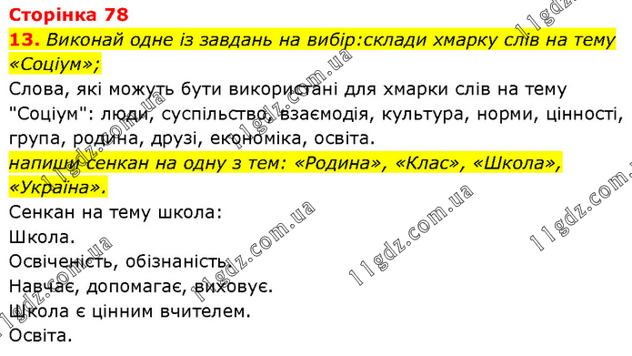 Виконай одне із завдань на вибір:склади хмарку слів на тему «Соціум»; Слова, які можуть бути використані для хмарки слів на тему "Соціум": люди, суспільство, взаємодія, культура, норми, цінності, група, родина, друзі, економіка, освіта. напиши сенкан на одну з тем: «Родина», «Клас», «Школа», «Україна». Сенкан на тему школа: Школа. Освіченість, обізнаність. Навчає, допомагає, виховує. Школа є цінним вчителем. Освіта.