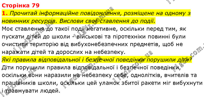 Прочитай інформаційне повідомлення, розміщене на одному з новинних ресурсів. Вислови своє ставлення до події. Моє ставлення до такої події негативне, оскільки перед тим, як пускати дітей до школи - військові та піротехніки повинні були очистити територію від вибухонебезпечних предметів, щоб не наражати дітей та дорослих на небезпеку. Які правила відповідальної і безпечної поведінки порушили діти? Діти порушили правила відповідальної і безпечної поведінки, оскільки вони наразили на небезпеку себе, однолітків, вчителів та працівників школи, оскільки цей уламок збитої ракети міг вибухнути і травмувати людей.