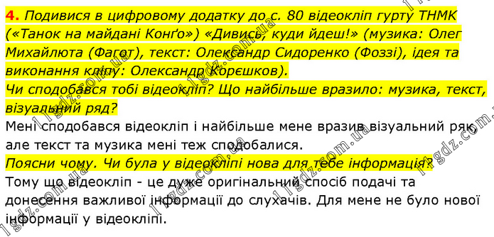 Подивися в цифровому додатку до с. 80 відеокліп гурту THMK («Танок на майдані Конґо») «Дивись, куди йдеш!» (музика: Олег Михайлюта (Фагот), текст: Олександр Сидоренко (Фоззі), ідея та виконання кліпу: Олександр Корєшков). Чи сподобався тобі відеокліп? Що найбільше вразило: музика, текст, візуальний ряд? Мені сподобався відеокліп і найбільше мене вразив візуальний ряк, але текст та музика мені теж сподобалися. Поясни чому. Чи була у відеокліпі нова для тебе інформація? Тому що відеокліп - це дуже оригінальний спосіб подачі та донесення важливої інформації до слухачів. Для мене не було нової інформації у відеокліпі.