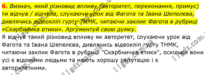 Визнач, який різновид впливу (авторитет, переконання, примус) ти відчув / відчула, слухаючи урок від Фагота та Івана Шепелєва, дивлячись відеокліп гурту THMK, читаючи заклик Фагота в рубриці «Скарбничка етики». Аргументуй свою думку. Я відчув такий різновид впливу як авторитет, слухаючи урок від Фагота та Івана Шепелєва, дивлячись відеокліп гурту ТНМК, читаючи заклик Фагота в рубриці "Скарбничка етики", оскільки вони усі є відомими людьми та мають хорошу репутацію і є авторитетними.