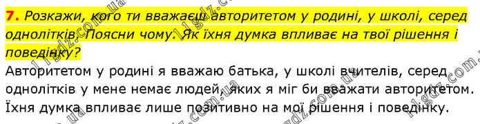 Розкажи, кого ти вважаєш авторитетом у родині, у школі, серед однолітків. Поясни чому. Як їхня думка впливає на твої рішення і поведінку? Авторитетом у родині я вважаю батька, у школі вчителів, серед однолітків у мене немає людей, яких я міг би вважати авторитетом. Їхня думка впливає лише позитивно на мої рішення і поведінку.