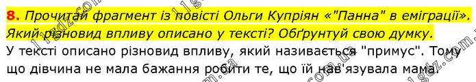 Прочитай фрагмент із повісті Ольги Купріян «"Панна" в еміграції». Який різновид впливу описано у тексті? Обґрунтуй свою думку. У тексті описано різновид впливу, який називається "примус". Тому що дівчина не мала бажання робити те, що їй нав'язувала мама.