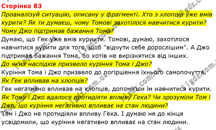 Проаналізуй ситуацію, описану у фрагменті. Хто з хлопців уже вмів курити? Як ти думаєш, чому Томові захотілося навчитися курити? Чому Джо підтримав бажання Тома? Думаю, що Гек уже вмів куриити. Томові, думаю, захотілося навчитися курити для того, щоб "відчути себе дорослішим". А Джо підтримав бажання Тома, бо хотів не вирізнятися від інших. До яких наслідків призвело куріння Тома і Джо? Куріння Тома і Джо призвело до погіршення їхнього самопочуття. Як Гек впливав на хлопців? Гек негативно впливав на хлопців, допомігши їм навчитися курити. Як Тому і Джо вдалося протидіяти впливу Гека? Чи зрозуміли Том і Джо, що куріння негативно впливає на стан людини? Том і Джо не протидіяли впливу Гека. І думаю не до кінця усвідомили, що куріння негативно впливає на стан людини.