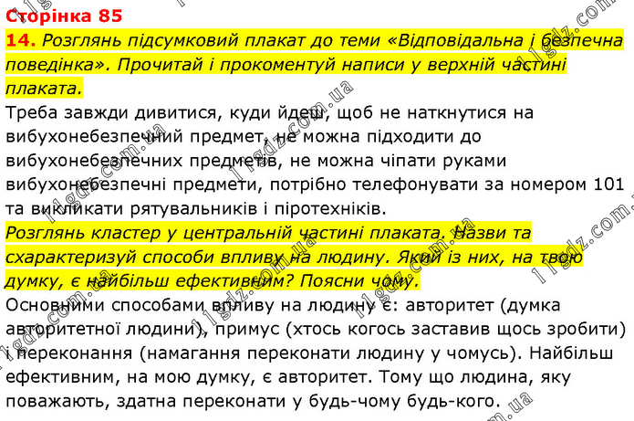 Розглянь підсумковий плакат до теми «Відповідальна і безпечна поведінка». Прочитай і прокоментуй написи у верхній частині плаката. Треба завжди дивитися, куди йдеш, щоб не наткнутися на вибухонебезпечний предмет, не можна підходити до вибухонебезпечних предметів, не можна чіпати руками вибухонебезпечні предмети, потрібно телефонувати за номером 101 та викликати рятувальників і піротехніків. Розглянь кластер у центральній частині плаката. Назви та схарактеризуй способи впливу на людину. Який із них, на твою думку, є найбільш ефективним? Поясни чому. Основними способами впливу на людину є: авторитет (думка авторитетної людини), примус (хтось когось заставив щось зробити) і переконання (намагання переконати людину у чомусь). Найбільш ефективним, на мою думку, є авторитет. Тому що людина, яку поважають, здатна переконати у будь-чому будь-кого.