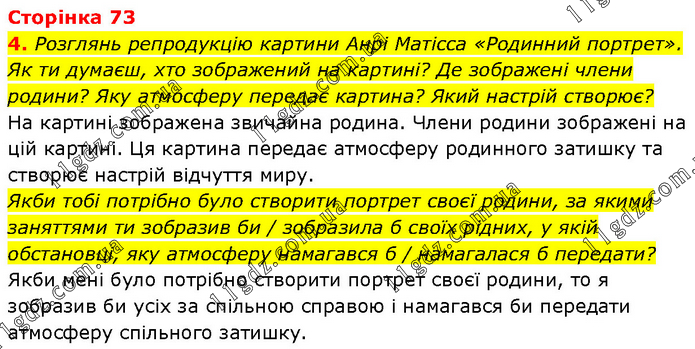 Розглянь репродукцію картини Анрі Матісса «Родинний портрет». Як ти думаєш, хто зображений на картині? Де зображені члени родини? Яку атмосферу передає картина? Який настрій створює? На картині зображена звичайна родина. Члени родини зображені на цій картині. Ця картина передає атмосферу родинного затишку та створює настрій відчуття миру. Якби тобі потрібно було створити портрет своєї родини, за якими заняттями ти зобразив би / зобразила б своїх рідних, у якій обстановці, яку атмосферу намагався б / намагалася б передати? Якби мені було потрібно створити портрет своєї родини, то я зобразив би усіх за спільною справою і намагався би передати атмосферу спільного затишку.
