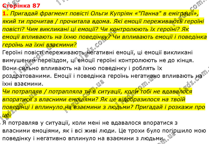 Пригадай фрагмент повісті Ольги Купріян «"Панна" в еміграції», який ти прочитав / прочитала вдома. Які емоції переживають героїні повісті? Чим викликані ці емоції? Чи контролюють їх героїні? Як емоції впливають на їхню поведінку? Чи впливають емоції і поведінка героїнь на їхні взаємини? Героїні повісті переживають негативні емоції, ці емоції викликані вимушеним переїздом, ці емоції героїні контролюють не до кінця. Вони сильно впливають на їхню поведінку і роблять їх роздратованими. Емоції і поведінка героїнь негативно впливають на їхні взаємини. Чи потрапляв / потрапляла ти в ситуації, коли тобі не вдавалося впоратися з власними емоціями? Як це відобразилося на твоїй поведінці і вплинуло на взаємини з людьми? Пригадай і розкажи про це. Я потравляв у ситуації, коли мені не вдавалося впоратися з власними емоціями, як і всі живі люди. Це трохи було погіршило мою поведінку і негативно вплинуло на взаємини з людьми.