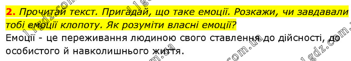 Прочитай текст. Пригадай, що таке емоції. Розкажи, чи завдавали тобі емоції клопоту. Як розуміти власні емоції? Емоції - це переживання людиною свого ставлення до дійсності, до особистого й навколишнього життя.