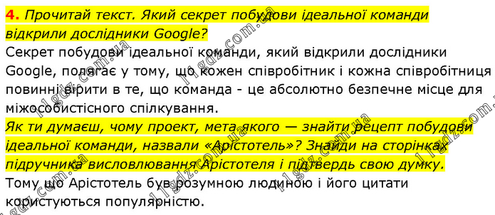 Прочитай текст. Який секрет побудови ідеальної команди відкрили дослідники Google? Секрет побудови ідеальної команди, який відкрили дослідники Google, полягає у тому, що кожен співробітник і кожна співробітниця повинні вірити в те, що команда - це абсолютно безпечне місце для міжособистісного спілкування. Як ти думаєш, чому проект, мета якого — знайти рецепт побудови ідеальної команди, назвали «Арістотель»? Знайди на сторінках підручника висловлювання Арістотеля і підтвердь свою думку. Тому що Арістотель був розумною людиною і його цитати користуються популярністю.
