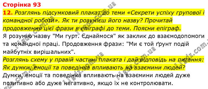 Розглянь підсумковий плакат до теми «Секрети успіху групової і командної роботи». Як ти розумієш його назву? Прочитай продовження цієї фрази в епіграфі до теми. Поясни епіграф. Я розумію назву "Ми гурт. Єднаймося" як заклик до взаємодопомоги та командної праці. Продовження фрази: "Ми є той ґрунт подій майбутніх вирішальних". Розглянь схему у правій частині плаката і дай відповідь на питання: Як думки, емоції та поведінка впливають на взаємини людей? Думки, емоції та поведінка впливають на взаємини людей дуже позитивно або дуже негативно, якщо їх не контролювати.