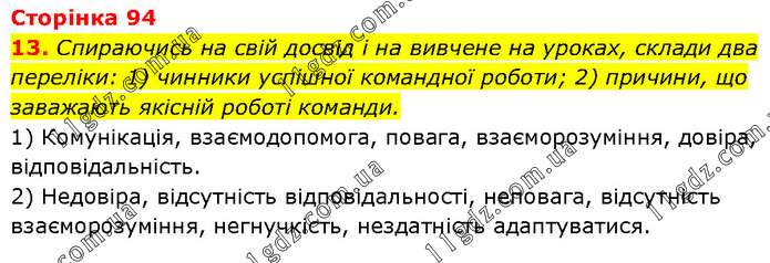 Спираючись на свій досвід і на вивчене на уроках, склади два переліки: 1) чинники успішної командної роботи; 2) причини, що заважають якісній роботі команди. 1) Комунікація, взаємодопомога, повага, взаєморозуміння, довіра, відповідальність. 2) Недовіра, відсутність відповідальності, неповага, відсутність взаєморозуміння, негнучкість, нездатність адаптуватися.