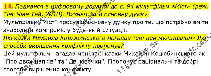 Подивися в цифровому додатку до с. 94 мультфільм «Міст» (реж. Тінг Чіан Тей, 2010). Визнач його основну думку. Мультфільм "Міст" просуває основну думку про те, що потрібно вміти знаходити компроміс у будь-якій ситуації. Які казки Михайла Коцюбинського нагадав тобі цей мультфільм? Які способи вирішення конфлікту пропонує? Цей мультфільм нагадав мені такі казки Михайли Коцюбинського як "Про двох цапків" та "Дві кізочки". Пропонує раціональні та добрі способи вирішення конфлікту.