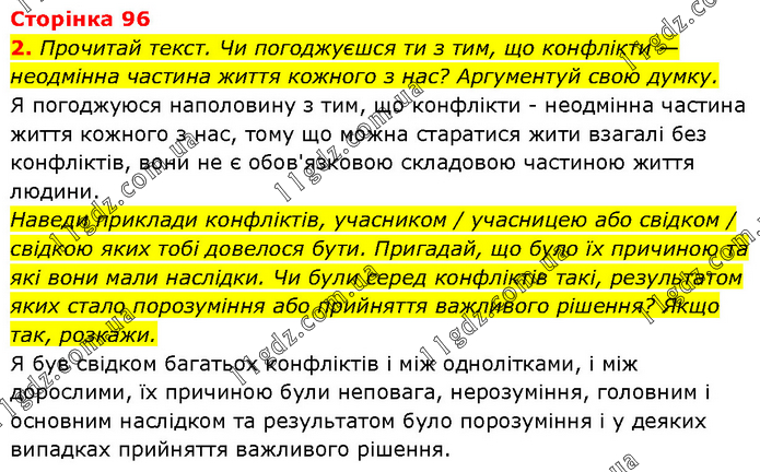 Прочитай текст. Чи погоджуєшся ти з тим, що конфлікти — неодмінна частина життя кожного з нас? Аргументуй свою думку. Я погоджуюся наполовину з тим, що конфлікти - неодмінна частина життя кожного з нас, тому що можна старатися жити взагалі без конфліктів, вони не є обов'язковою складовою частиною життя людини. Наведи приклади конфліктів, учасником / учасницею або свідком / свідкою яких тобі довелося бути. Пригадай, що було їх причиною та які вони мали наслідки. Чи були серед конфліктів такі, результатом яких стало порозуміння або прийняття важливого рішення? Якщо так, розкажи. Я був свідком багатьох конфліктів і між однолітками, і між дорослими, їх причиною були неповага, нерозуміння, головним і основним наслідком та результатом було порозуміння і у деяких випадках прийняття важливого рішення.