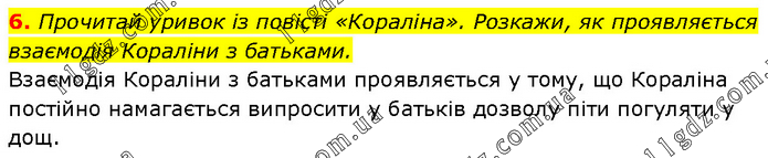 Прочитай уривок із повісті «Кораліна». Розкажи, як проявляється взаємодія Кораліни з батьками. Взаємодія Кораліни з батьками проявляється у тому, що Кораліна постійно намагається випросити у батьків дозволу піти погуляти у дощ.