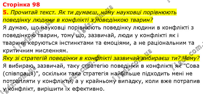 Прочитай текст. Як ти думаєш, чому науковці порівнюють поведінку людини в конфлікті з поведінкою тварин? Я думаю, що науковці порівнюють поведінку людини в конфлікті з поведінкою тварин, тому що, зазвичай, люди у конфлікті як і тварини керуються інстинктами та емоціями, а не раціональним та критичним мисленням. Яку зі стратегій поведінки в конфлікті зазвичай вибираєш ти? Чому? Я вибираю, зазвичай, таку стратегію поведінки в конфлікті як "Сова (співпраця)", оскільки така стратегія найбільше підходить мені не потрапляти у конфлікти, а у крайньому випадку, коли вже потрапив у конфлікт, вирішити їх ефективно.