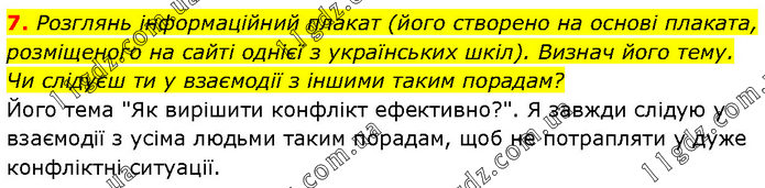 Розглянь інформаційний плакат (його створено на основі плаката, розміщеного на сайті однієї з українських шкіл). Визнач його тему. Чи слідуєш ти у взаємодії з іншими таким порадам? Його тема "Як вирішити конфлікт ефективно?". Я завжди слідую у взаємодії з усіма людьми таким порадам, щоб не потрапляти у дуже конфліктні ситуації.