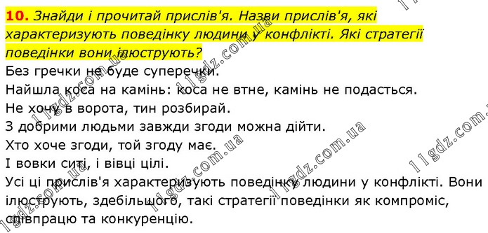 Знайди і прочитай прислів'я. Назви прислів'я, які характеризують поведінку людини у конфлікті. Які стратегії поведінки вони ілюструють? Без гречки не буде суперечки. Найшла коса на камінь: коса не втне, камінь не подасться. Не хочу в ворота, тин розбирай. З добрими людьми завжди згоди можна дійти. Хто хоче згоди, той згоду має. І вовки ситі, і вівці цілі. Усі ці прислів'я характеризують поведінку людини у конфлікті. Вони ілюструють, здебільшого, такі стратегії поведінки як компроміс, співпрацю та конкуренцію.