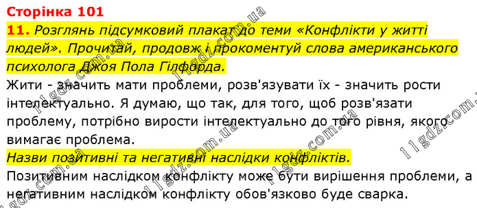 Розглянь підсумковий плакат до теми «Конфлікти у житті людей». Прочитай, продовж і прокоментуй слова американського психолога Джоя Пола Гілфорда. Жити - значить мати проблеми, розв'язувати їх - значить рости інтелектуально. Я думаю, що так, для того, щоб розв'язати проблему, потрібно вирости інтелектуально до того рівня, якого вимагає проблема. Назви позитивні та негативні наслідки конфліктів. Позитивним наслідком конфлікту може бути вирішення проблеми, а негативним наслідком конфлікту обов'язково буде сварка.