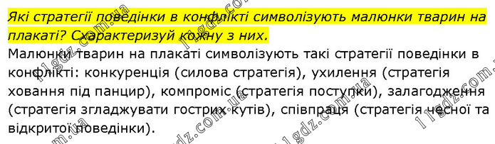 Які стратегії поведінки в конфлікті символізують малюнки тварин на плакаті? Схарактеризуй кожну з них. Малюнки тварин на плакаті символізують такі стратегії поведінки в конфлікті: конкуренція (силова стратегія), ухилення (стратегія ховання під панцир), компроміс (стратегія поступки), залагодження (стратегія згладжувати гострих кутів), співпраця (стратегія чесної та відкритої поведінки).