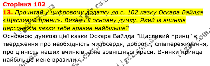Прочитай у цифровому додатку до с. 102 казку Оскара Вайлда «Щасливий принц». Визнач її основну думку. Який із вчинків персонажів казки тебе вразив найбільше? Основною думкою цієї казки Оскара Вайлда "Щасливий принц" є твердження про необхідність милосердя, доброти, співпереживання, про цінність наших вчинків, а не зовнішньої краси. Вчинки принца найбільше мене вразили.