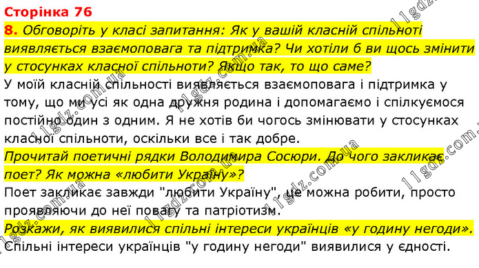 Обговоріть у класі запитання: Як у вашій класній спільноті виявляється взаємоповага та підтримка? Чи хотіли б ви щось змінити у стосунках класної спільноти? Якщо так, то що саме? У моїй класній спільності виявляється взаємоповага і підтримка у тому, що ми усі як одна дружня родина і допомагаємо і спілкуємося постійно один з одним. Я не хотів би чогось змінювати у стосунках класної спільноти, оскільки все і так добре. Прочитай поетичні рядки Володимира Сосюри. До чого закликає поет? Як можна «любити Україну»? Поет закликає завжди "любити Україну", це можна робити, просто проявляючи до неї повагу та патріотизм. Розкажи, як виявилися спільні інтереси українців «у годину негоди». Спільні інтереси українців "у годину негоди" виявилися у єдності.
