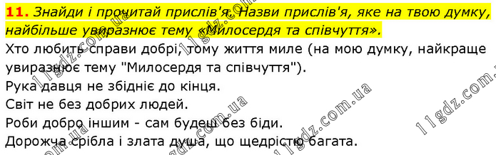 Знайди і прочитай прислів'я. Назви прислів'я, яке на твою думку, найбільше увиразнює тему «Милосердя та співчуття». Хто любить справи добрі, тому життя миле (на мою думку, найкраще увиразнює тему "Милосердя та співчуття"). Рука давця не збідніє до кінця. Світ не без добрих людей. Роби добро іншим - сам будеш без біди. Дорожча срібла і злата душа, що щедрістю багата.