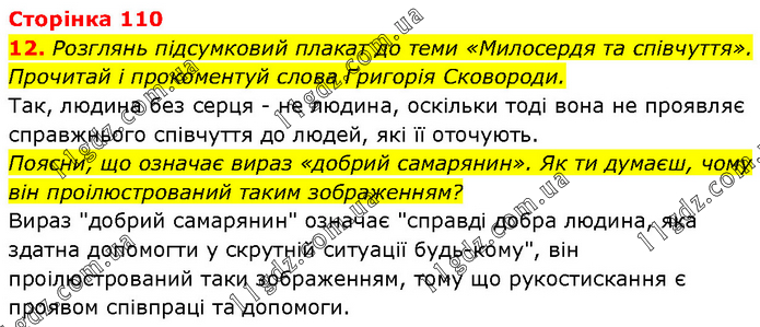 Розглянь підсумковий плакат до теми «Милосердя та співчуття». Прочитай і прокоментуй слова Григорія Сковороди. Так, людина без серця - не людина, оскільки тоді вона не проявляє справжнього співчуття до людей, які її оточують. Поясни, що означає вираз «добрий самарянин». Як ти думаєш, чому він проілюстрований таким зображенням? Вираз "добрий самарянин" означає "справді добра людина, яка здатна допомогти у скрутній ситуації будь-кому", він проілюстрований таки зображенням, тому що рукостискання є проявом співпраці та допомоги.