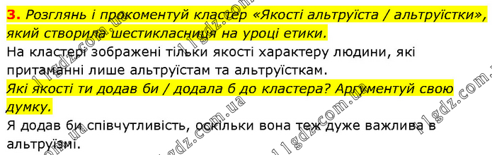 Розглянь і прокоментуй кластер «Якості альтруїста / альтруїстки», який створила шестикласниця на уроці етики. На кластері зображені тільки якості характеру людини, які притаманні лише альтруїстам та альтруїсткам. Які якості ти додав би / додала б до кластера? Аргументуй свою думку. Я додав би співчутливість, оскільки вона теж дуже важлива в альтруїзмі.