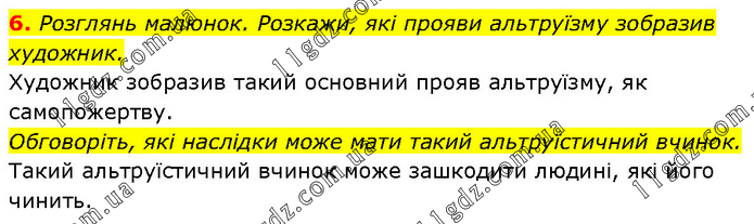Розглянь малюнок. Розкажи, які прояви альтруїзму зобразив художник. Художник зобразив такий основний прояв альтруїзму, як самопожертву. Обговоріть, які наслідки може мати такий альтруїстичний вчинок. Такий альтруїстичний вчинок може зашкодити людині, які його чинить.