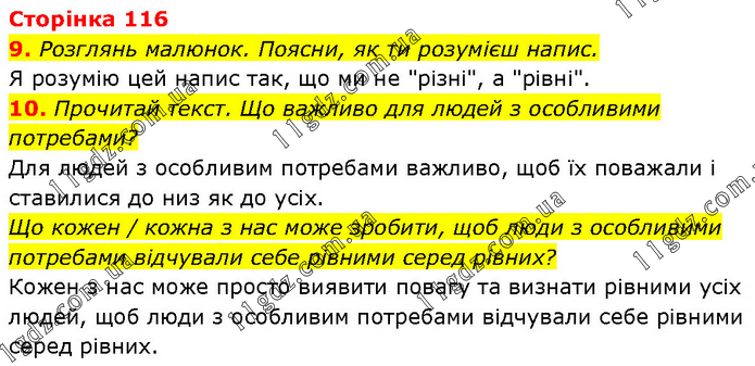 9. Розглянь малюнок. Поясни, як ти розумієш напис. Я розумію цей напис так, що ми не "різні", а "рівні". 10. Прочитай текст. Що важливо для людей з особливими потребами? Для людей з особливим потребами важливо, щоб їх поважали і ставилися до низ як до усіх. Що кожен / кожна з нас може зробити, щоб люди з особливими потребами відчували себе рівними серед рівних? Кожен з нас може просто виявити повагу та визнати рівними усіх людей, щоб люди з особливим потребами відчували себе рівними серед рівних.