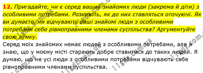 Пригадайте, чи є серед ваших знайомих люди (закрема й діти) з особливими потребами. Розкажіть, як до них ставляться оточуючі. Як ви думаєте, чи відчувають ваші знайомі люди з особливими потребами себе рівноправними членами суспільства? Аргументуйте свою думку. Серед моїх знайомих немає людей з особливими потребами, але я знаю, що у моєму місті старають добре ставитися до таких людей. Я думаю, що не усі люди з особливими потребами відчувають себе рівноправними членами суспільства.