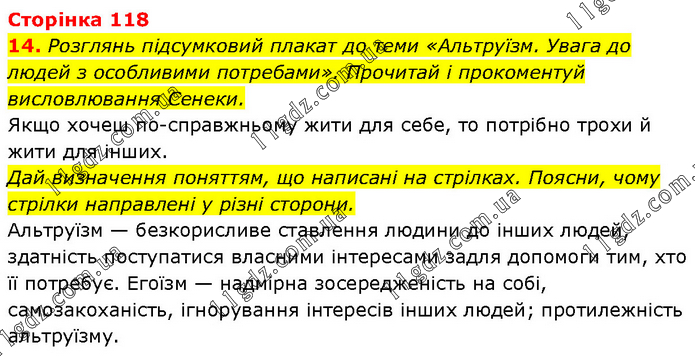 Розглянь підсумковий плакат до теми «Альтруїзм. Увага до людей з особливими потребами». Прочитай і прокоментуй висловлювання Сенеки. Якщо хочеш по-справжньому жити для себе, то потрібно трохи й жити для інших. Дай визначення поняттям, що написані на стрілках. Поясни, чому стрілки направлені у різні сторони. Альтруїзм — безкорисливе ставлення людини до інших людей, здатність поступатися власними інтересами задля допомоги тим, хто її потребує. Егоїзм — надмірна зосередженість на собі, самозакоханість, ігнорування інтересів інших людей; протилежність альтруїзму.