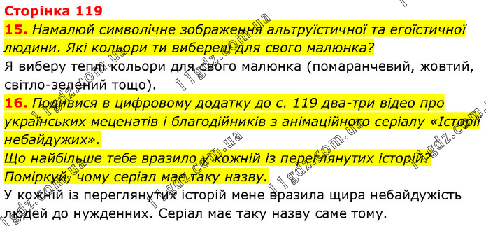 15. Намалюй символічне зображення альтруїстичної та егоїстичної людини. Які кольори ти вибереш для свого малюнка? Я виберу теплі кольори для свого малюнка (помаранчевий, жовтий, світло-зелений тощо). 16. Подивися в цифровому додатку до с. 119 два-три відео про українських меценатів і благодійників з анімаційного серіалу «Історії небайдужих». Що найбільше тебе вразило у кожній із переглянутих історій? Поміркуй, чому серіал має таку назву. У кожній із переглянутих історій мене вразила щира небайдужість людей до нужденних. Серіал має таку назву саме тому.