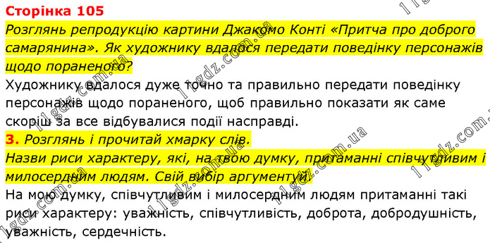 Розглянь репродукцію картини Джакомо Конті «Притча про доброго самарянина». Як художнику вдалося передати поведінку персонажів щодо пораненого? Художнику вдалося дуже точно та правильно передати поведінку персонажів щодо пораненого, щоб правильно показати як саме скоріш за все відбувалися події насправді. 3. Розглянь і прочитай хмарку слів. Назви риси характеру, які, на твою думку, притаманні співчутливим і милосердним людям. Свій вибір аргументуй. На мою думку, співчутливим і милосердним людям притаманні такі риси характеру: уважність, співчутливість, доброта, добродушність, уважність, сердечність.