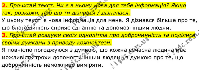2. Прочитай текст. Чи є в ньому нова для тебе інформація? Якщо так, розкажи, про що ти дізнався / дізналася. У цьому тексті є нова інформація для мене. Я дізнався більше про те, що благодійність сприяє єднанню та допомозі іншим людям. 3. Прочитай роздуми своїх однолітків про доброчинність та поділися своїми думками з приводу кожної тези. Я повністю погоджуюся з думкою, що кожна сучасна людина має можливість трохи допомогти іншим людям і з думкою про те, що доброчинність неможливо виміряти.