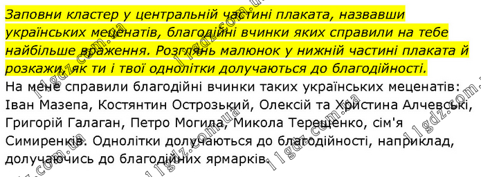 Заповни кластер у центральній частині плаката, назвавши українських меценатів, благодійні вчинки яких справили на тебе найбільше враження. Розглянь малюнок у нижній частині плаката й розкажи, як ти і твої однолітки долучаються до благодійності. На мене справили благодійні вчинки таких українських меценатів: Іван Мазепа, Костянтин Острозький, Олексій та Христина Алчевські, Григорій Галаган, Петро Могила, Микола Терещенко, сім'я Симиренків. Однолітки долучаються до благодійності, наприклад, долучаючись до благодійних ярмарків.