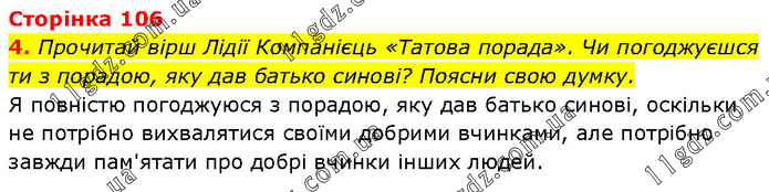 Прочитай вірш Лідії Компанієць «Татова порада». Чи погоджуєшся ти з порадою, яку дав батько синові? Поясни свою думку. Я повністю погоджуюся з порадою, яку дав батько синові, оскільки не потрібно вихвалятися своїми добрими вчинками, але потрібно завжди пам'ятати про добрі вчинки інших людей.