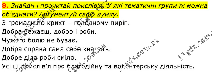 Знайди і прочитай прислів'я. У які тематичні групи їх можна об'єднати? Аргументуй свою думку. З громади по крихті - голодному пиріг. Добра бажаєш, добро і роби. Чужого болю не буває. Добра справа сама себе хвалить. Добре діло роби сміло. Усі ці прислів'я про благодійну та волонтерську діяльність.