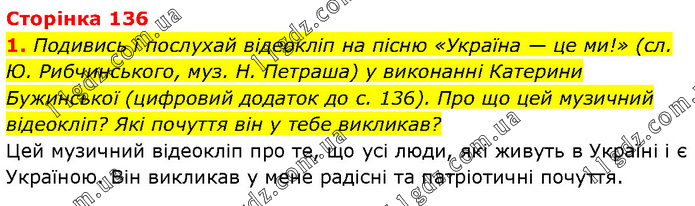 Подивись і послухай відеокліп на пісню «Україна — це ми!» (сл. Ю. Рибчинського, муз. Н. Петраша) у виконанні Катерини Бужинської (цифровий додаток до с. 136). Про що цей музичний відеокліп? Які почуття він у тебе викликав? Цей музичний відеокліп про те, що усі люди, які живуть в Україні і є Україною. Він викликав у мене радісні та патріотичні почуття.